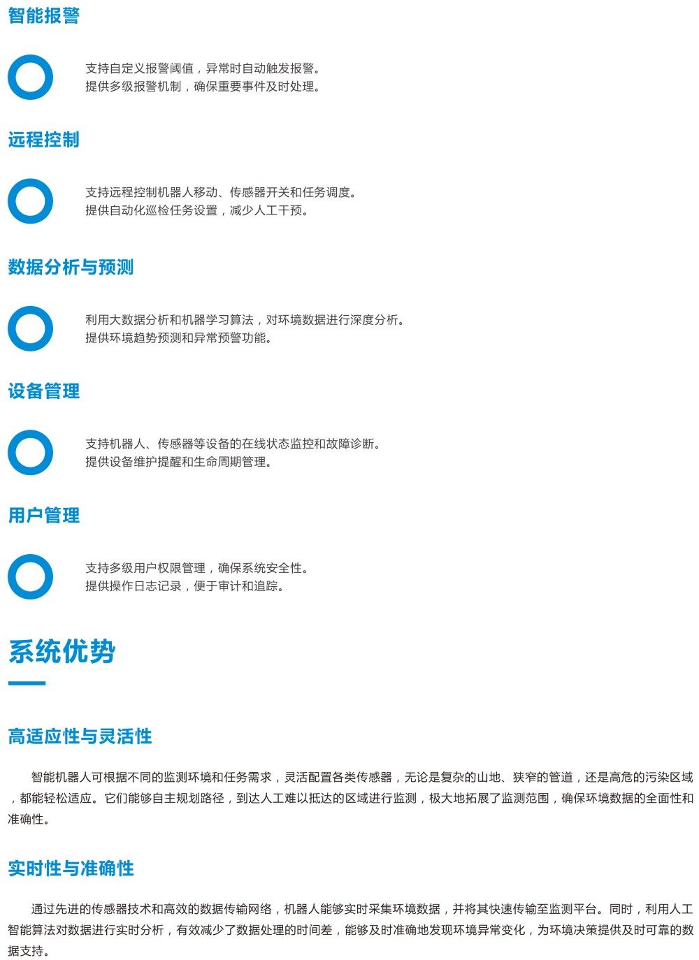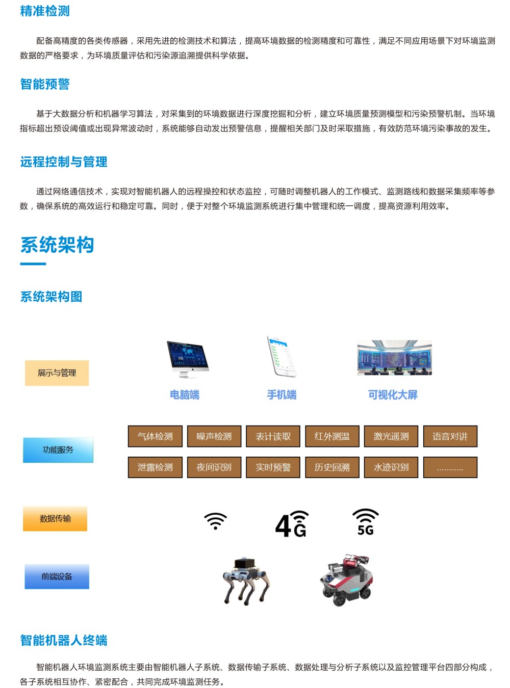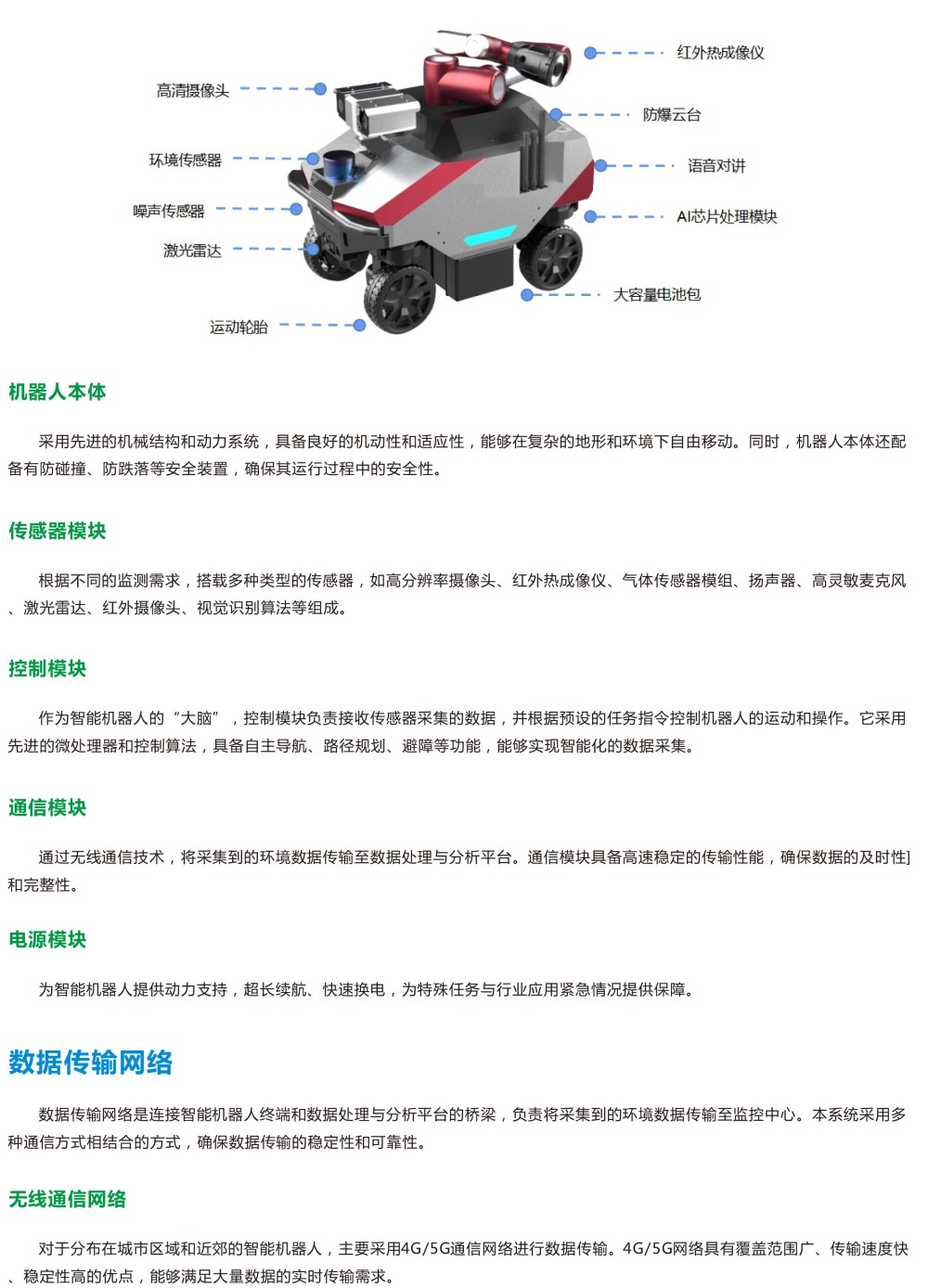 隨著科技的飛速發(fā)展以及人們對環(huán)境保護意識的日益增強,傳統(tǒng)的環(huán)境監(jiān)測手段在面對復雜多變的環(huán)境狀況時逐漸暴露出諸多局限性。例如,人工采樣監(jiān)測不僅耗費大量的人力、物力和時間,而且難以實現(xiàn)實時、連續(xù)的監(jiān)測;固定監(jiān)測站點分布有限,無法覆蓋各類區(qū)域,導致部分環(huán)境數(shù)據(jù)存在監(jiān)測盲區(qū)。在這樣的背景下,構(gòu)建一套準確、智能化的智能機器人環(huán)境監(jiān)測系統(tǒng)迫在眉睫。該系統(tǒng)將充分利用機器人技術(shù)、傳感器技術(shù)、通信技術(shù)以及數(shù)據(jù)處理與分析技術(shù),實現(xiàn)對環(huán)境的多層次、實時動態(tài)監(jiān)測,為環(huán)境保護、污染治理以及生態(tài)可持續(xù)發(fā)展提供強有力的數(shù)據(jù)支持和決策依據(jù)。
